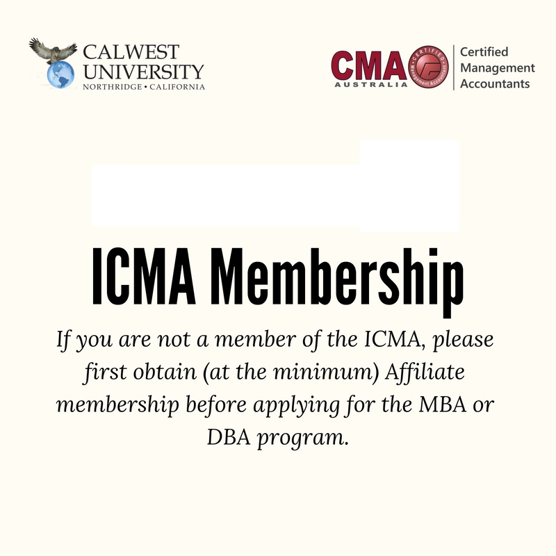 Calwest University’s education programs are exclusively for members of the Institute of Certified Management Accountants, a bona fide professional organization. Calwest University’s education programs are sponsored by a bona fide professional organization that offers educational programs solely for that organization's membership, has met the qualifications for exemption from regulation under the Act, pursuant to California Education Code (CEC) section 94874 (b)(1). Please note that this does not imply that Calwest University has approval to operate pursuant to section 94886 or 94890 of the Code. Instead, as an Exempt Institution, it is exempt from regulation under the Act.
